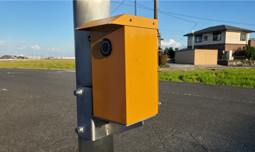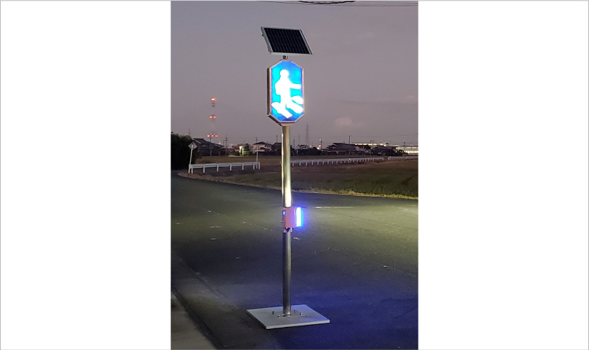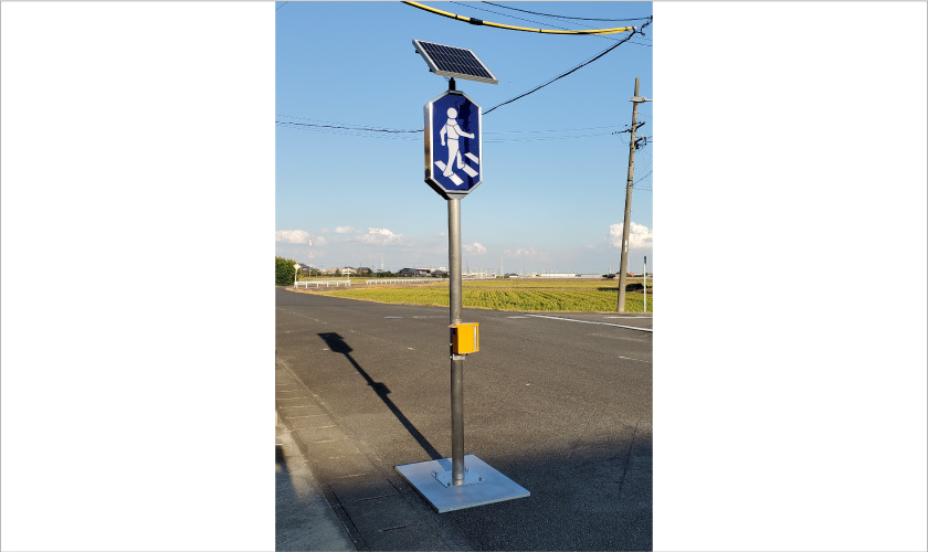 信号機のない横断歩道に設置できます。ソーラーパネル付きで電源不要です。